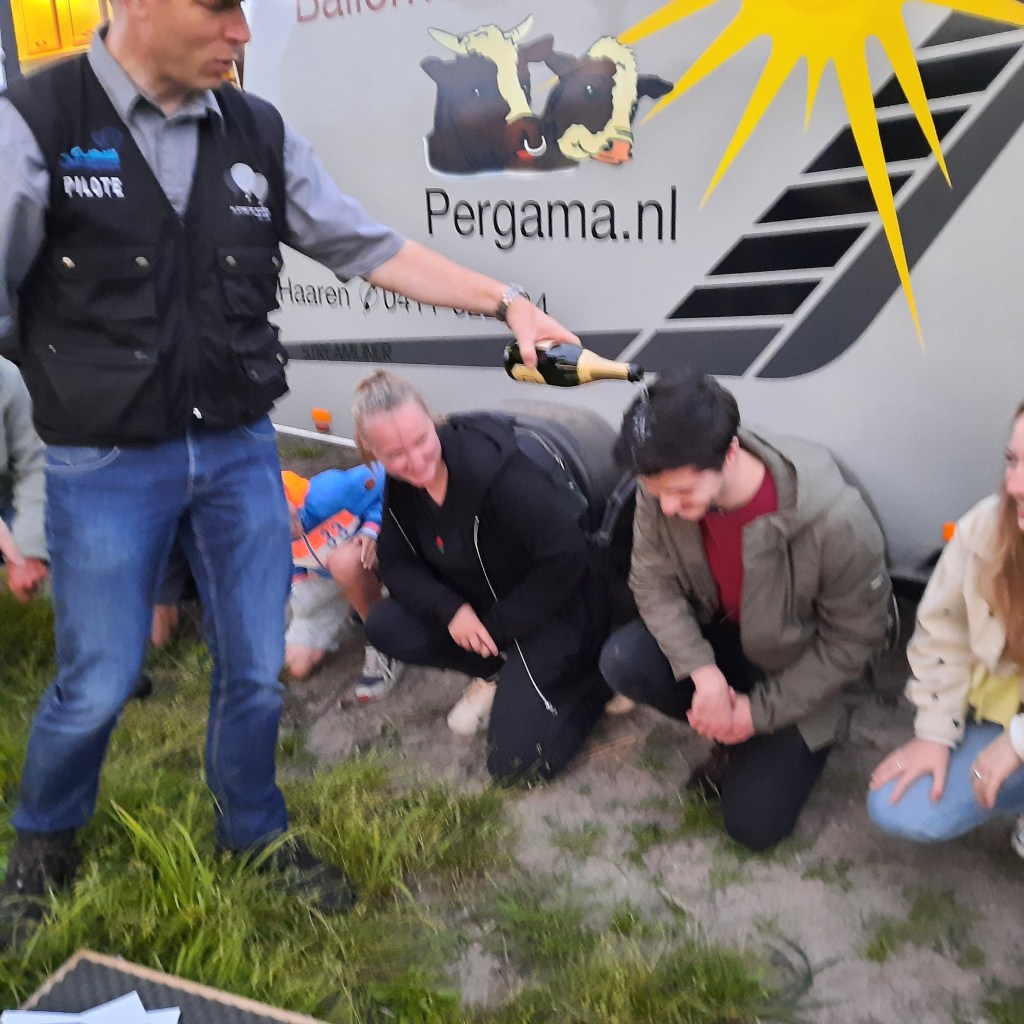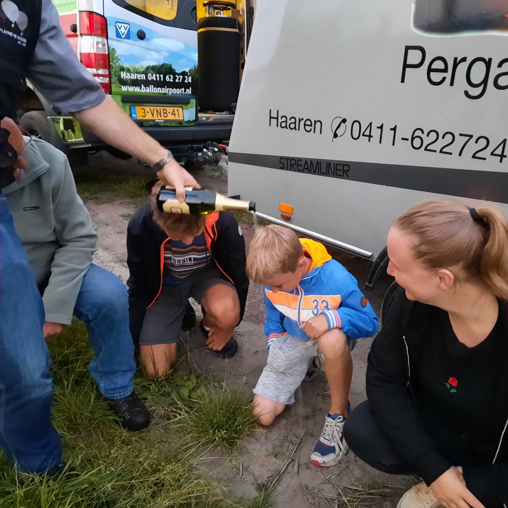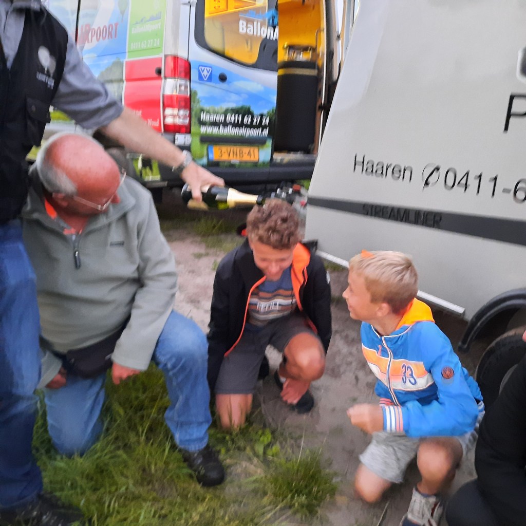 Alle ballonvaarders kregen daar een glas champagne (Timo gezien zijjn leeftijd water) en daarne werden allen, nadat piloot Rud kort de geschiedenis van het ballonvaren had verteld, gedoopt tot baron of barones van Oisterwijk tot Moergestel. Kleinzoon Timo werd speciaal gedoopt tot co-piloot/baron van Oisterwijk tot Moergestel. Daarna kregen we allen een diploma als herinnering aan deze ballonvaart.