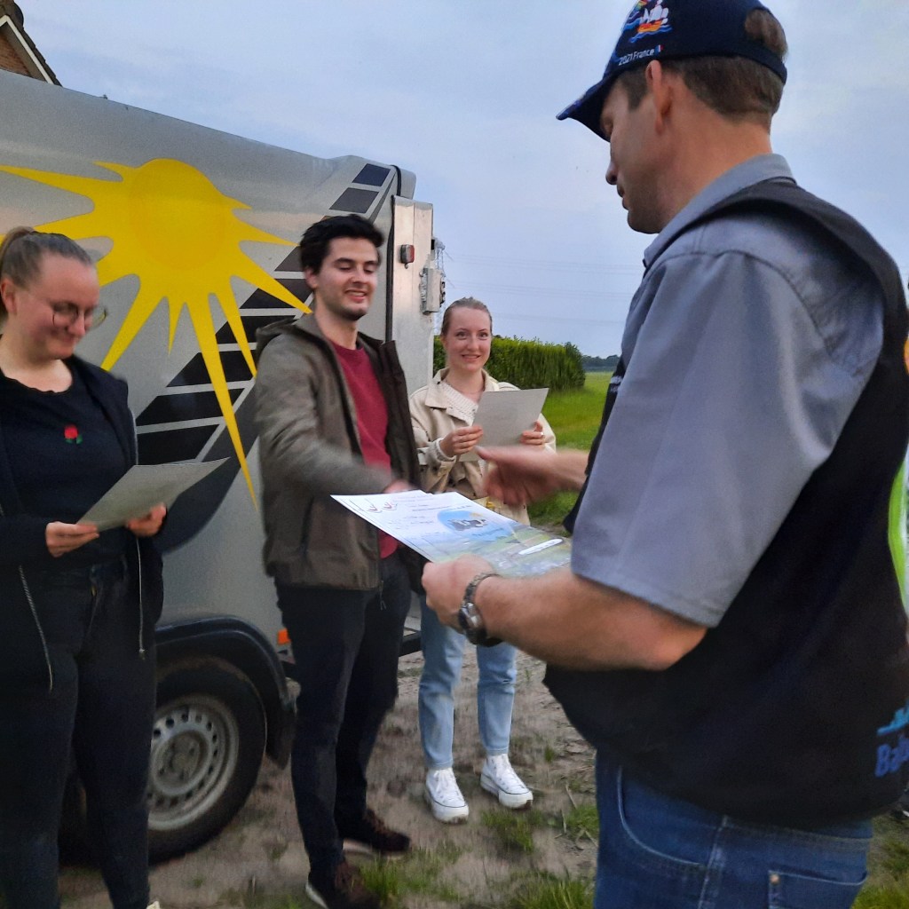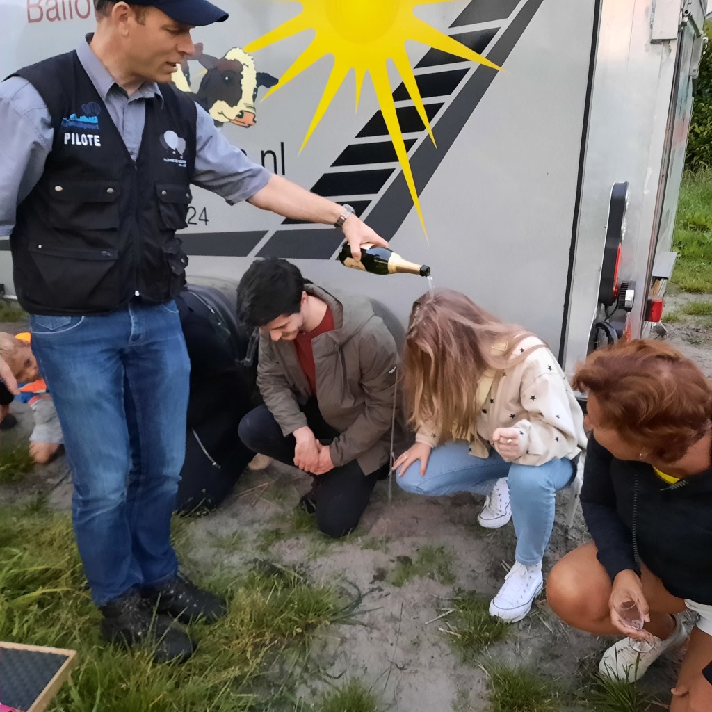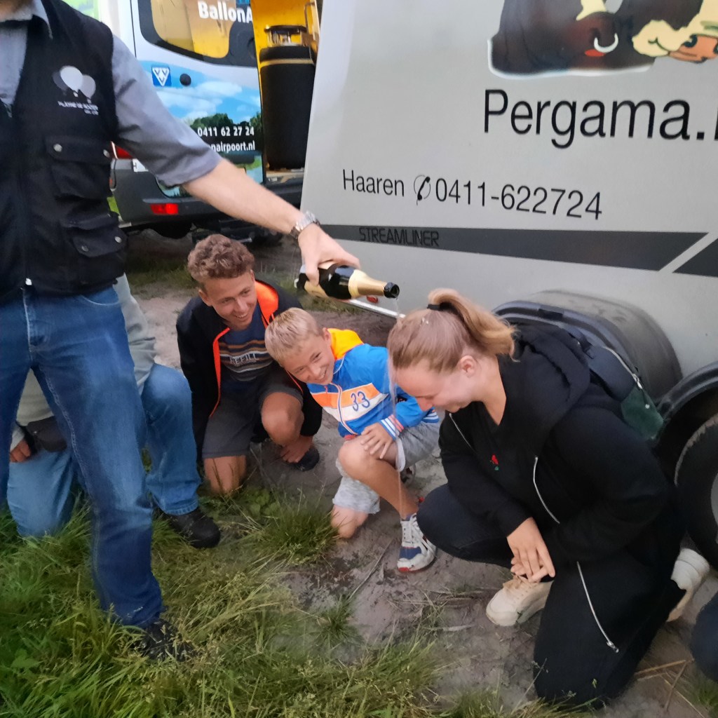 Alle ballonvaarders kregen daar een glas champagne (Timo gezien zijjn leeftijd water) en daarne werden allen, nadat piloot Rud kort de geschiedenis van het ballonvaren had verteld, gedoopt tot baron of barones van Oisterwijk tot Moergestel. Kleinzoon Timo werd speciaal gedoopt tot co-piloot/baron van Oisterwijk tot Moergestel. Daarna kregen we allen een diploma als herinnering aan deze ballonvaart.