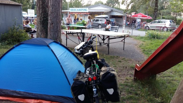 Daar na een kop koffie verder. Eerst een paar druppels, maar al snel in de stromende regen naar beneden, soms onverhard. Nadat ik om 13.00 uur Leny gebeld had bij een koffiestop werd het gelukkig droog. Om kwart vóór 4 op de camping een km of 3 vóór Brenzano. Op een veldje naast de camping (vol) tentje opgezet, toch weer regen en via Facebook en Ad-app getuige van het Europees kampioenschap voetbal van de dames door een 4 – 2 overwinning op Denemarken. Laat in de avond wordt het droog en gaat het behoorlijk waaien.