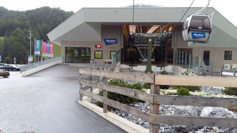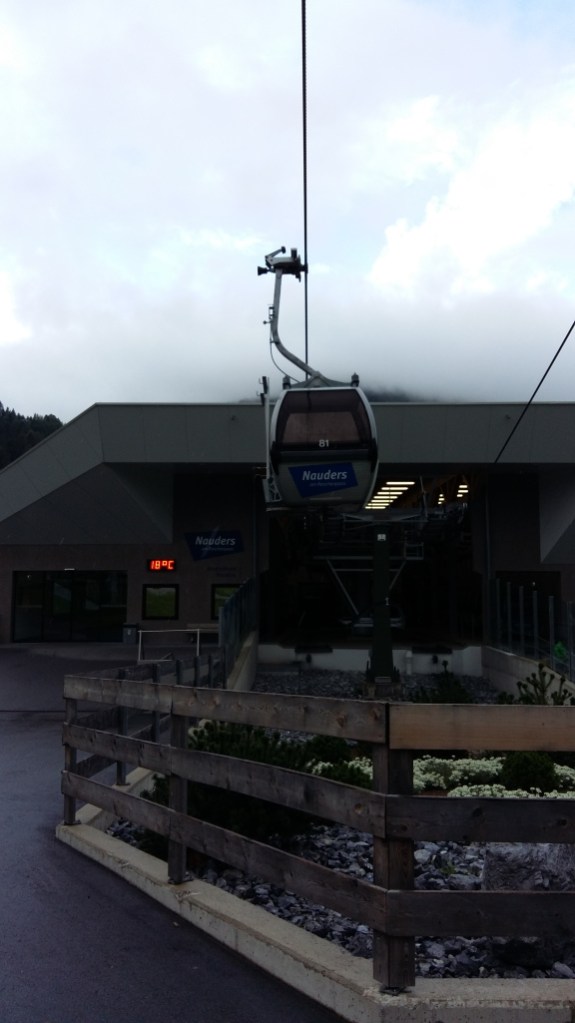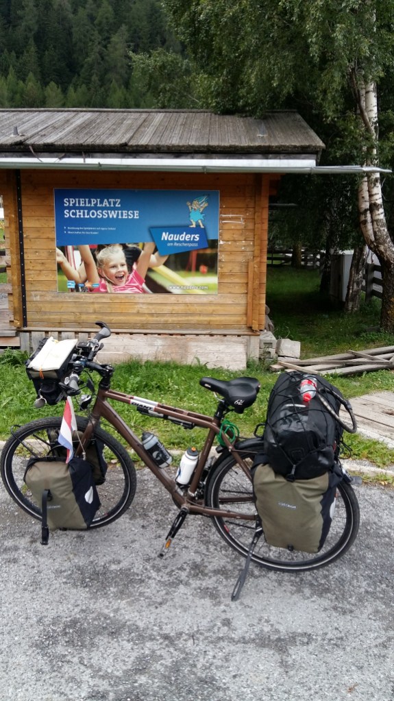 6 augustus half 7 op en ongeveer half acht naar het station. Nadat de bus was aangekomen, fiets op de aanhanger gezet door de chauffeur en na ongeveer een uur zo’n 4 km onder de top gestopt in Nauders. Precies om 10 uur bij de Reschensee.