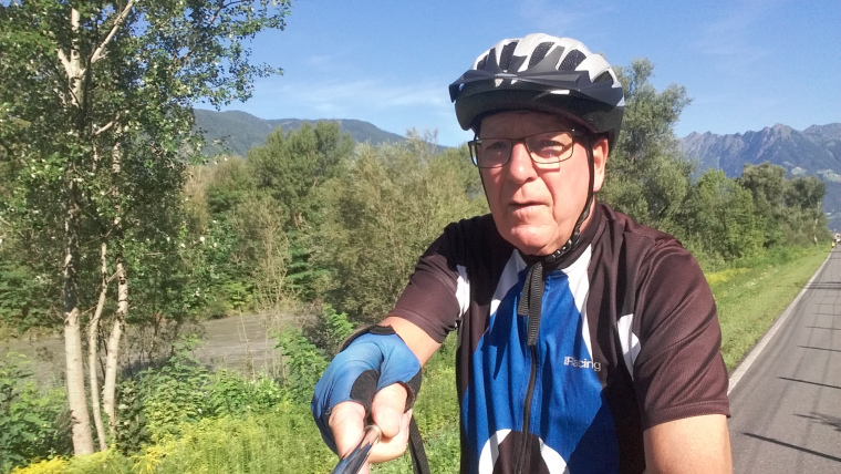 Op 4 augustus 2017 om 08.00 uur vertrokken. Eerst een heel stuk langs de rivier de Rijn. Vóór Bludenz kramp in mijn benen. Of te weinig gedronken of te weinig voorbereidende kilometers of een combinatie ervan. In Bludenz gelijk treinkaartje gekocht voor morgen 10.30 uur door de Arlberg in plaats van fietsen er overheen (1.793 m.). Daarna naar camping Sonnenberg en daar een plekje gevonden tussen 2 stacaravans in.