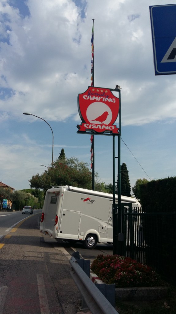 Dinsdag 8 augustus om 07.30 uur vertrokken. Al snel op de dijk langs de rivier de Adige, dat bleef ze tot aan Rovereto. Daar voor de aangegeven camping zo’n 10 km richting Gardameer en bij die camping vandaan nog 8 km naar Riva aan het Gardameer. Dus maar doorgefietst en om 14.30 uur bij Riva. Door naar Cisano (camping waar we straks in september ook met de caravan heen willen) en daar om 18.00 uur na 142 km. Lig door stukken met trein en bus en vandaag dit aantal kilometers 2 dagen vóór op mijn schema.