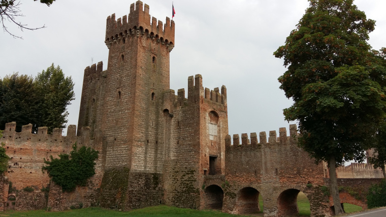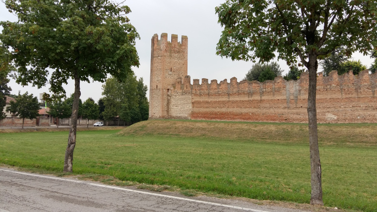 Op 10 augustus eerst weer een heel stuk langs de Adige, later saai stuk tussen de appels, peren, mais, tomaten enz. In Montagnana ontmoette ik 2 dames achterop, beide uit Limburg net onder Maastricht. Moeder was met de bus naar Verona gekomen en fietste het laatste stuk naar Rome samen met haar dochter, die vanuit Nederland gefietst heeft. Samen geluncht en toen via het VVV een B&B geboekt. Nogal moeilijk te vinden, maar was de moeite waard, een schitterende kamer in La Villa. Heerlijk gegeten in het door de eigenaresse aangewezen restaurant.