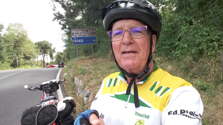 Zondag 13 augustus om 7 uur op en spullen weer op de fiets. Nog niemand te bekennen. Op een gegeven moment kwam een oudere man naar buiten om zijn poes buiten te zetten. Nadat hij gevraagd had wat ik wilde, pakte hij zijn telefoon en daar kwam een jonge dame aangelopen. Ik kon pas over een half uur ontbijten. Dat duurde me te lang, dus betaald en op pad. Al snel naar Barbarola en dat betekende – omdat ik inmiddels in de Apenijnen was aangekomen – zo’n anderhalf uur van de fiets af op een smal stijl weggetje. Naar de Passo della Raticosa (968 m) weer van de fiets af. Om 15.15 uur aangekomen op camping La Futa, 800 meter bergop bij de Passo della Futa. De temperatuur wees inmiddels overdag 37 graden Celsius aan.