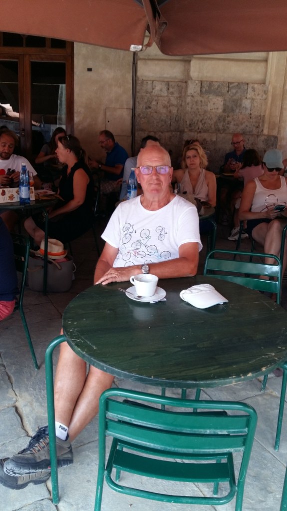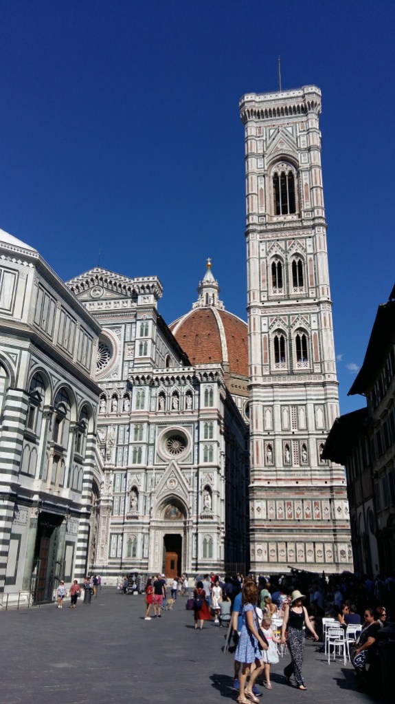Dinsdag 15 augustus wat later op, zo rond 8 uur. Na het douchen richting stad en een kop koffie met een broodje. Lopend door Florence verwijzing naar het huis van Dante en huis en museum bezocht. Na een salade als lunch nar de Dom. Om half twee de Dom in en weer veel foto’s gemaakt. Terug op de camping mijn telefoon opgeladen aan een bank bij het restaurant(je) en een pizza gegeten.