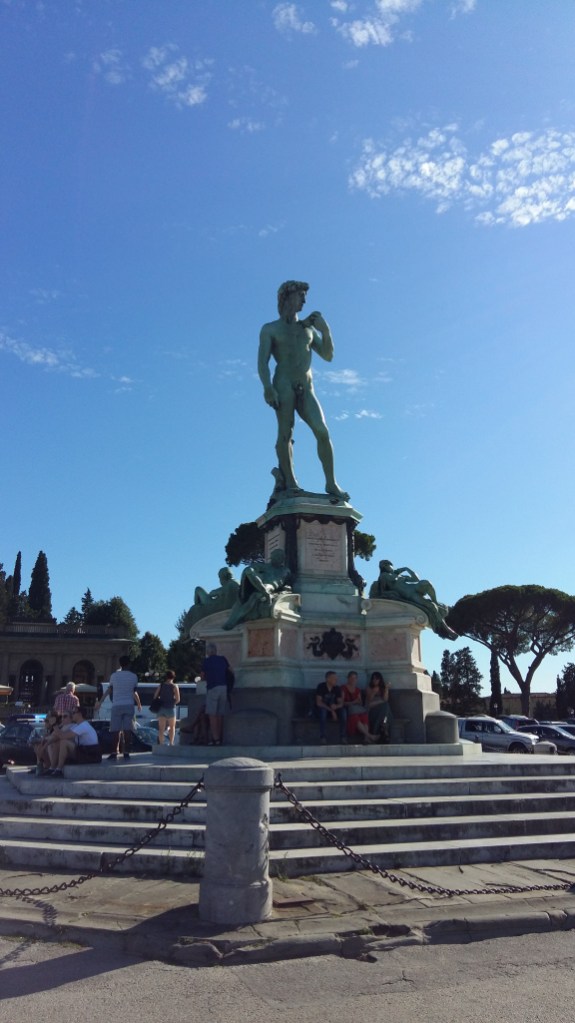 Op 14 augustus al heel snel na het vertrek weer van de fiets af en die omhoog duwen, wel zo’n 8 à 9 km lang. Door de hitte een beetje zweverig toen ik boven was, ondanks het vele drinken. Na 60 km aangekomen in Florence. Daar op de zuidoever vlakbij Piazzale Michelangelo een plek gevonden op camping Michelangelo. Tentje neergezet, uitgebreid gedoucht en toen naar de stad via de Ponte Vechio. Mooie brug, maar het was heel druk met alle toeristen. Op een plein een biertje gedronken, maar ik heb het maar bij één biertje gelaten, gelet op de prijs van € 9 per glas. Veel foto’s gemaakt en daarna weer terug naar de tent.