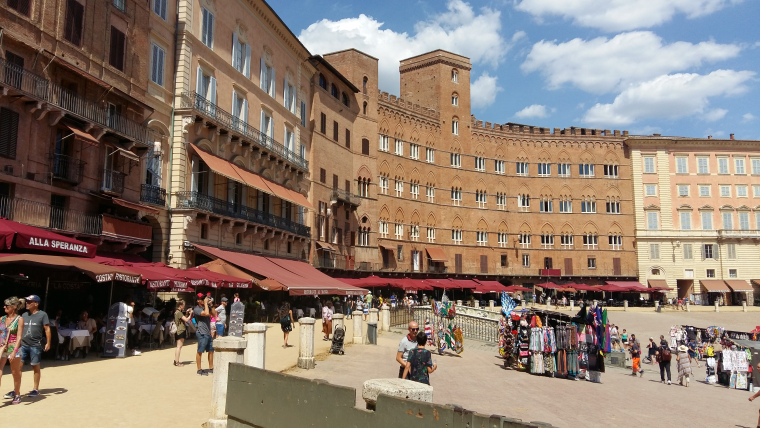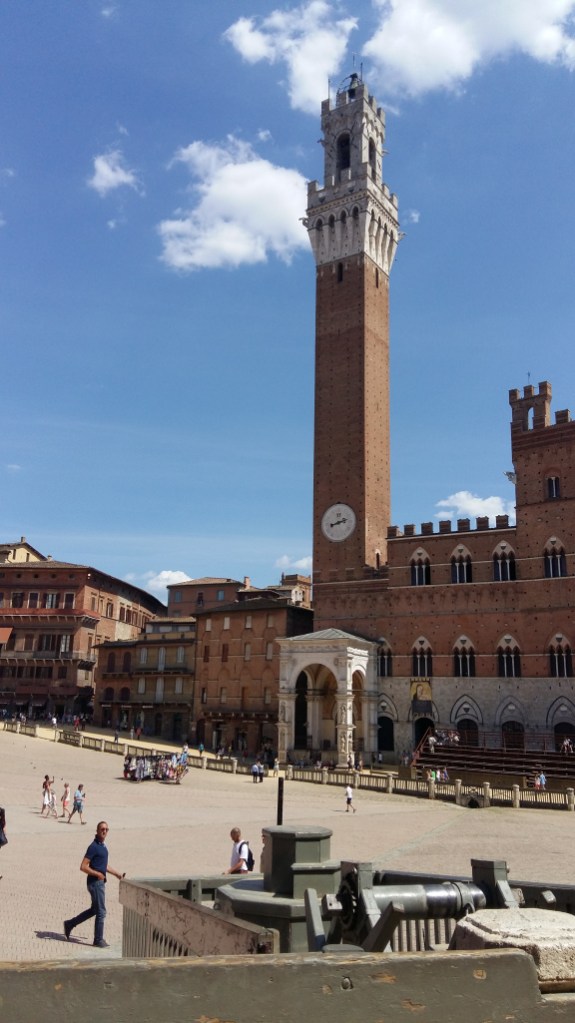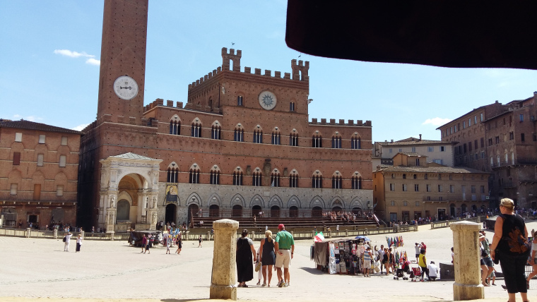 Donderdag 17 augustus om kwart over 7 op weg naar Sienna. Al heel snel toch weer van de fiets af. Om half twaalf reed ik Sienna binnen en om 12.00 uur aangekomen op camping Colleverde. Bloedheet. Tentje in de schaduw neergezet, maar na terugkomst uit de stad scheen de zon er toch weer fel op. Met de bus naar de stad en de Campo, het schelpvormig plein in het centrum, lag nog onder een laag kleiachtig zond, in verband met de Palio, die de dag tevoren was verreden. Na wat zoeken naar het busstation en terug naar de camping.