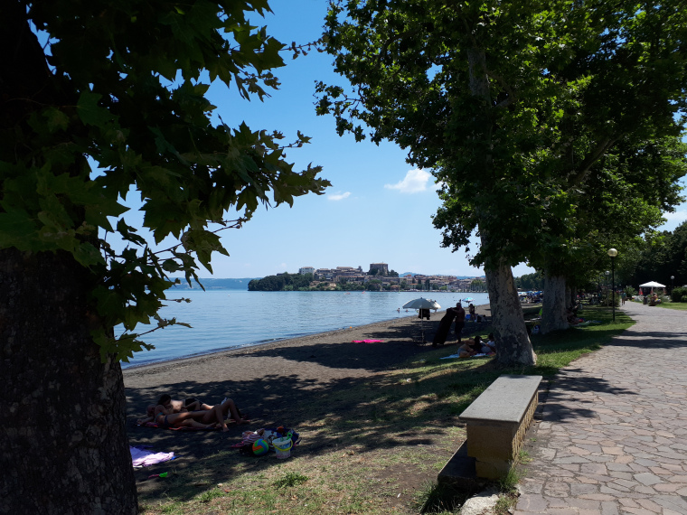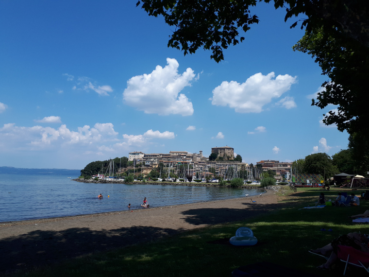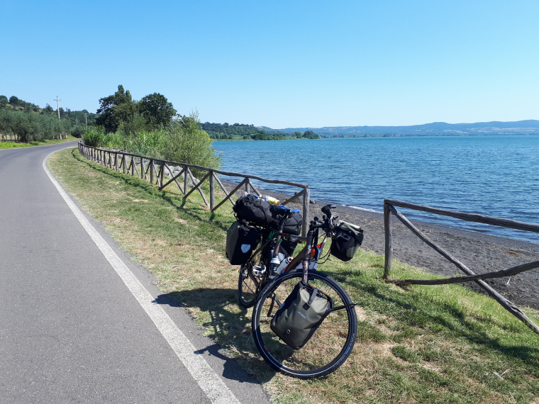 Donderdag 26 juli even na 7 uur vertrokken en het was al snel warm. Rond half twaalf op de plek waar ik wilde stoppen, maar daar was geen camping en ik had geen zin om weer naar een agroturismo te gaan, dus besloten maar verder te gaan na wat gegeten en gedronken te hebben. Pittig warm, dus veel water drinken onderweg. Rond 4 uur op de camping aan het Lago di Bracciano waar ik morgen wilde zijn. Na het douchen onder het genot van een grote fles Peroni op de tv van de camping naar de Tour de France gekeken. Kopgroep met Nicky Terpstra!
