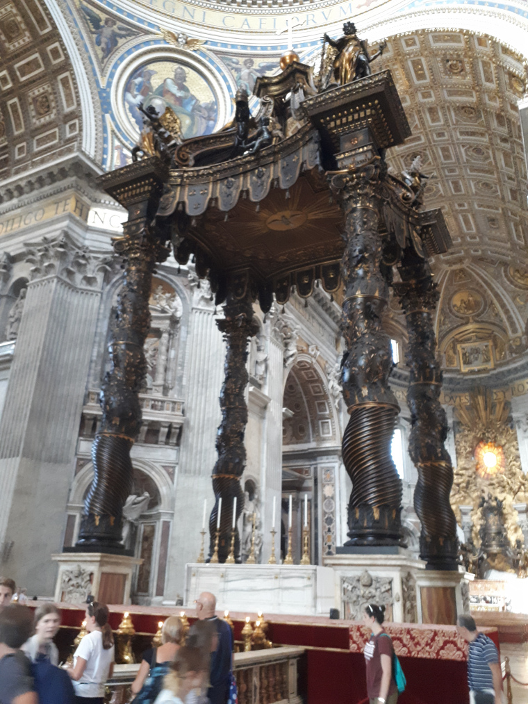 Woensdag 1 augustus naar de St. Pieter. `Ingevoegd` in de lange rij en daardoor al redelijk snel in de basiliek. Overweldigend mooi, maar in tegenstelling tot een aantal jaren terug niet meer mogelijk om in de crypten te kijken en ook niet meer naar boven rondom de koepel van de basiliek.