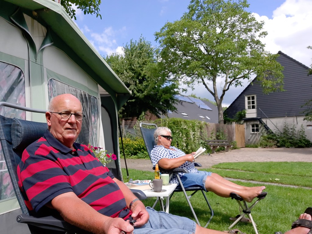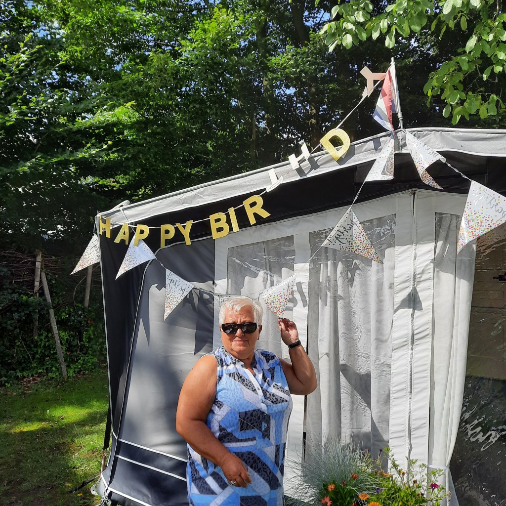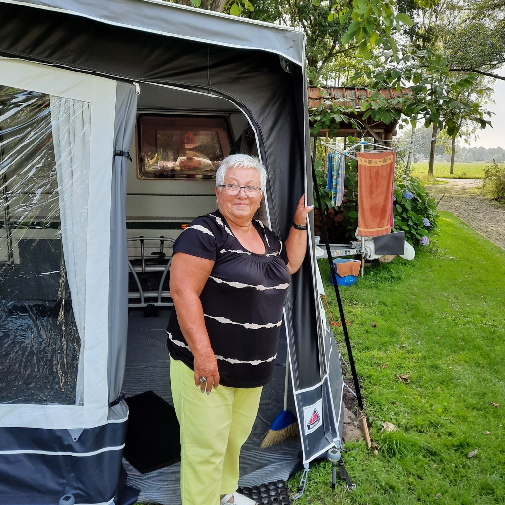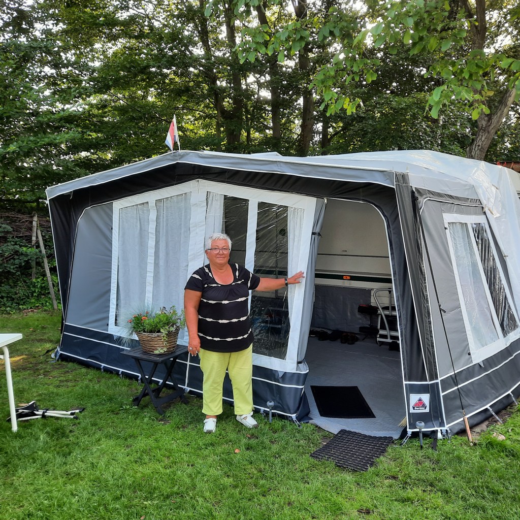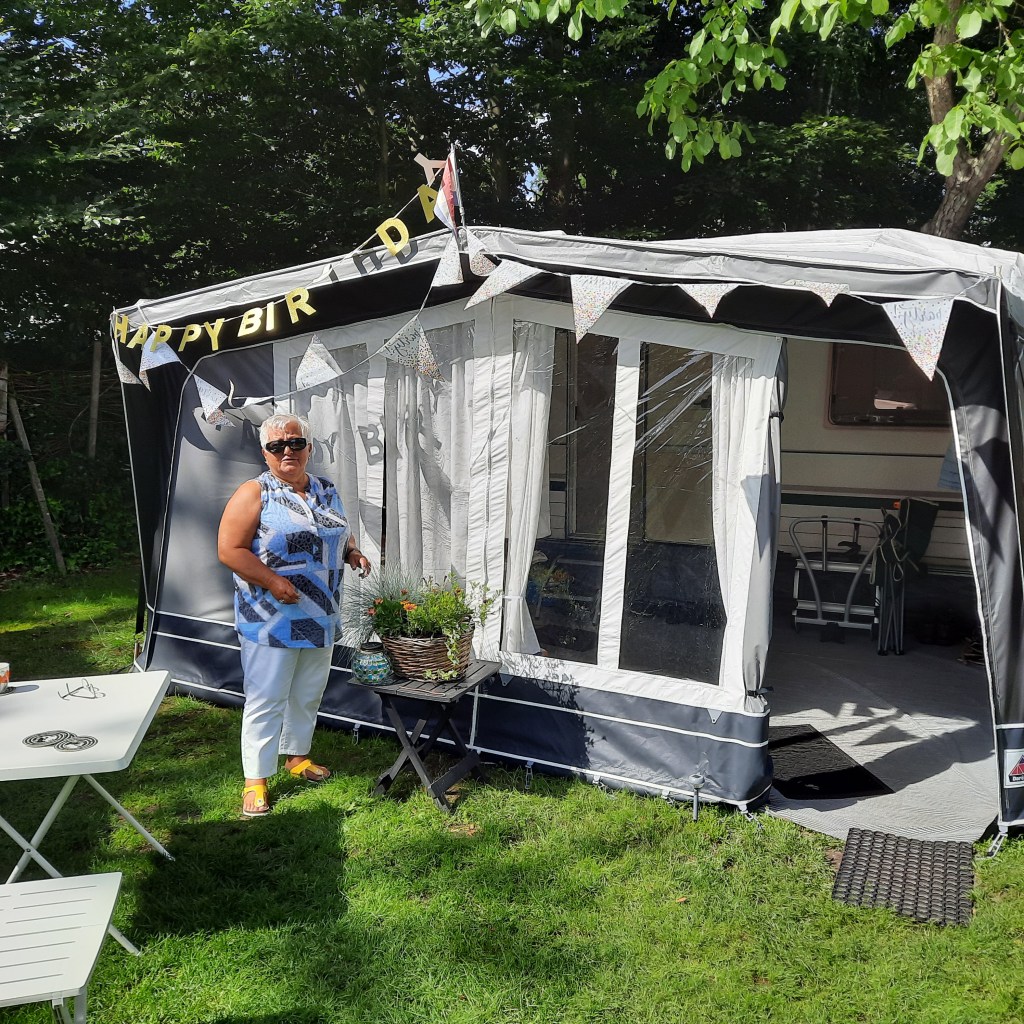 In verband met ons 55-jarig huwelijk in april 2021 kregen we van de kinderen een nieuwe voortent aan de caravan. Hier een foto die tijdens de verjaardag van Leny is gemaakt.