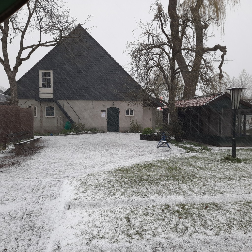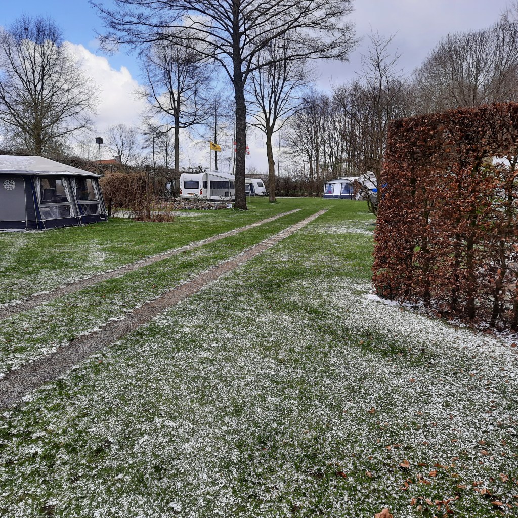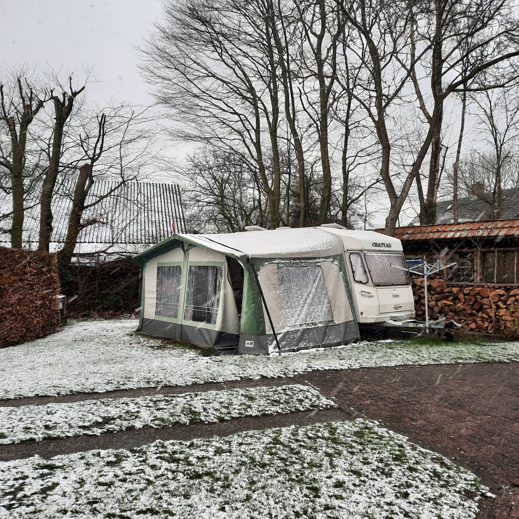 Een week later was het weer totaal omgeslagen en lag er – toen we wakker werden – een laag van 4 centimeter sneeuw op caravan e n voortent.